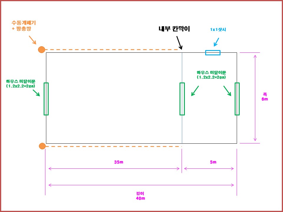 - 하우스 출입문 앞 2개, 중간2개, 뒤2개 미닫이문