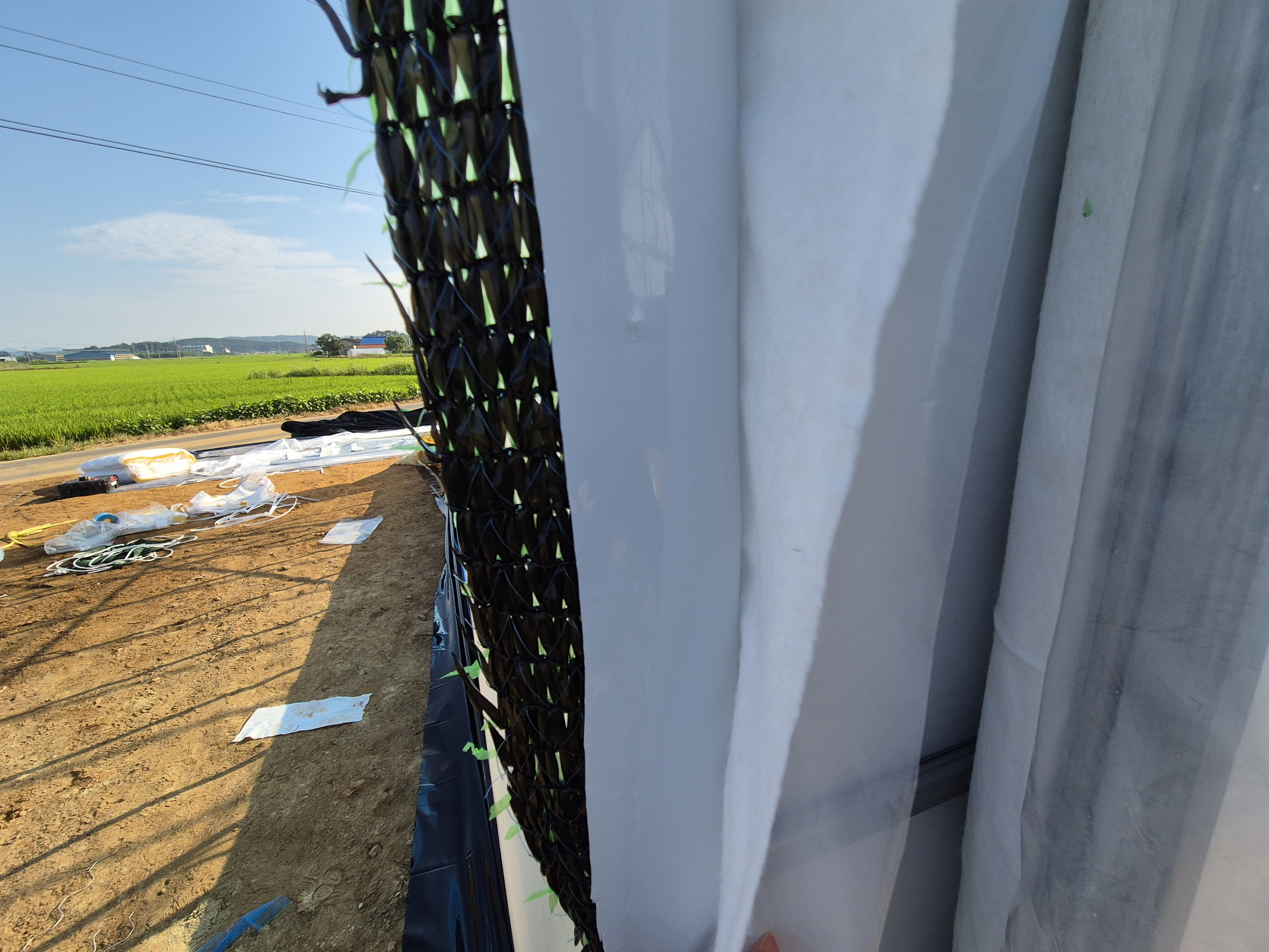 농막쪽 마감면에 장수비닐+압축솜+차광필름+사중직차광막으로