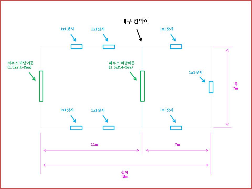 길이방향 에 1x1샷시창문을 3개씩 넣고