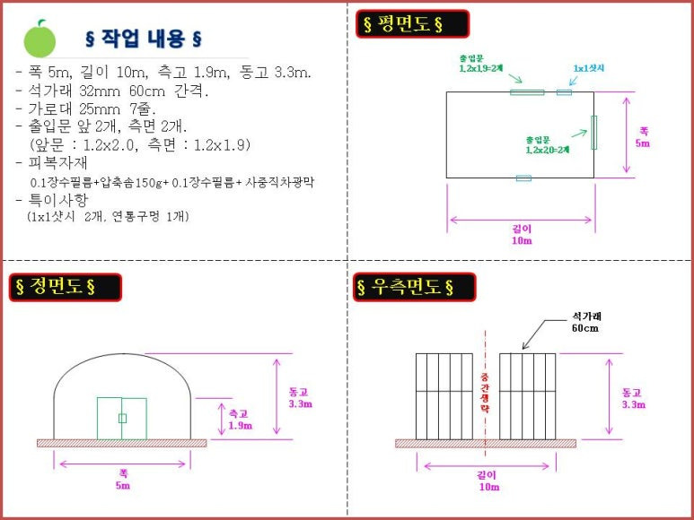 하우스 폭, 길이, 높이, 피복자재를 결정하시고