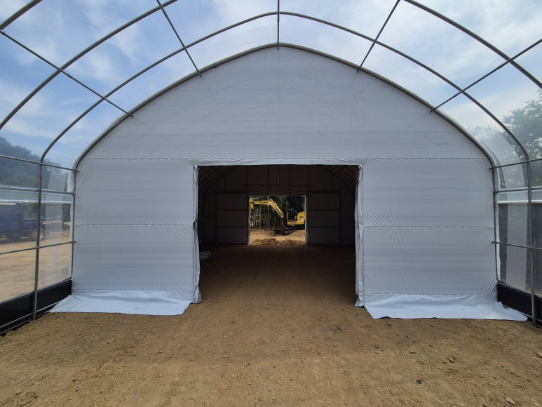 하우스 길이 21미터중 8미터 지점에 칸막이를 시공해주었습니다.